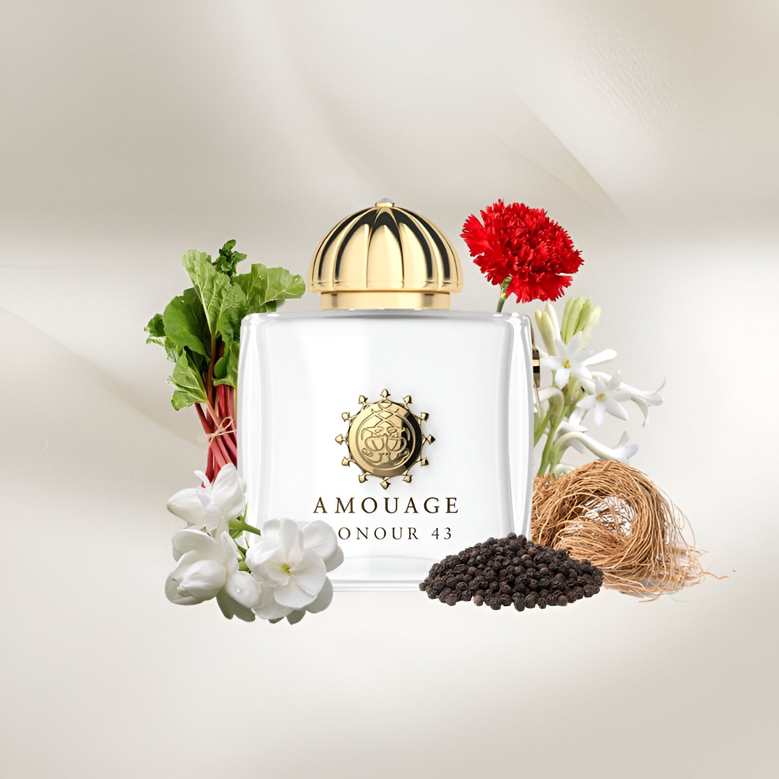 يغمرك عطر Amouage Honor 43 Extrait De Parfum برائحة مكثفة وفاخرة من الزهور البيضاء الرائعة، مستوحاة من الرومانسية المأساوية لمدام بترفلاي، مع رائحة فاخرة ودائمة.
