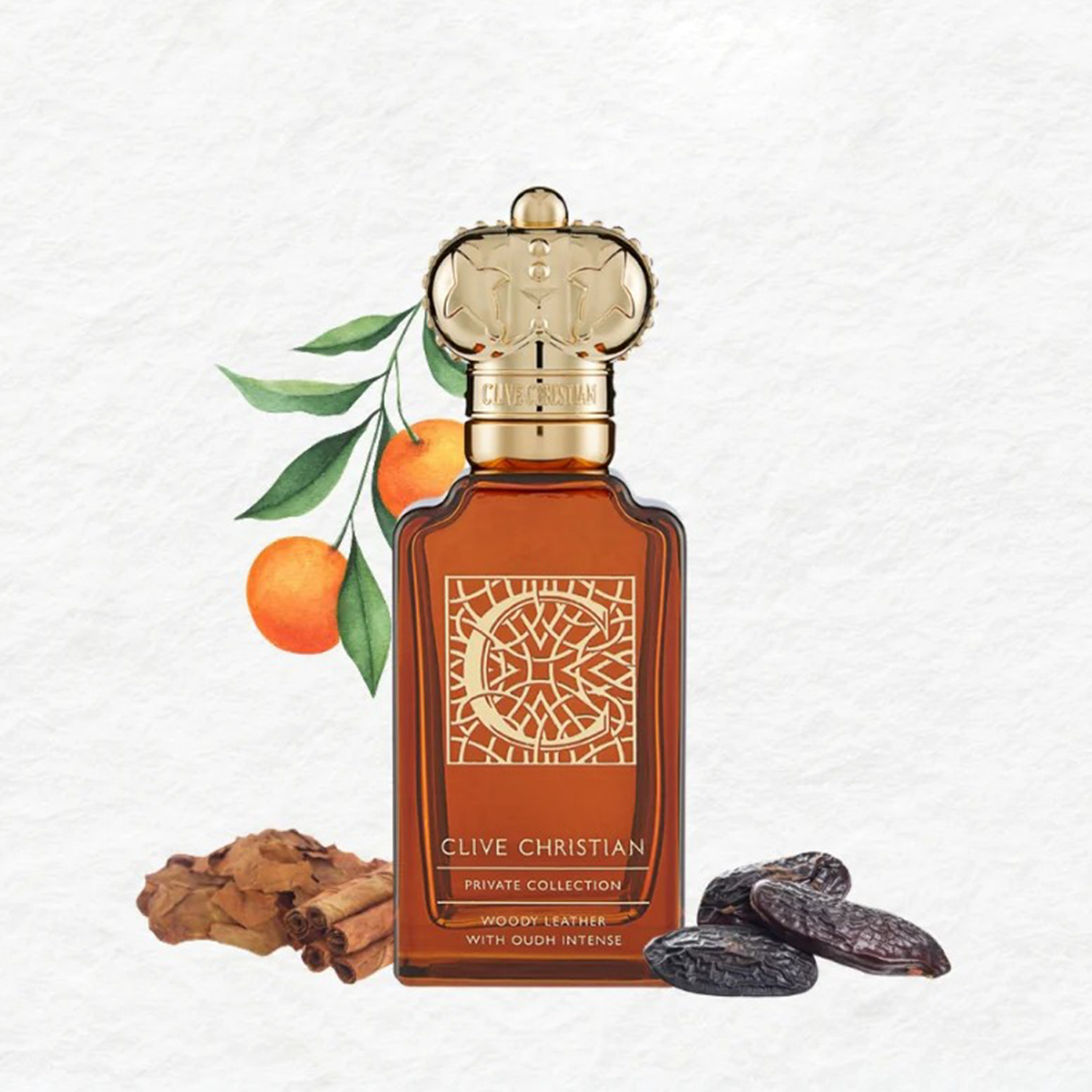Clive Christian Private Collection C Woody Leather Perfume smells rich and sophisticated, with warm notes of smoky tobacco, spicy saffron, and smooth leather, creating an elegant and captivating scent.