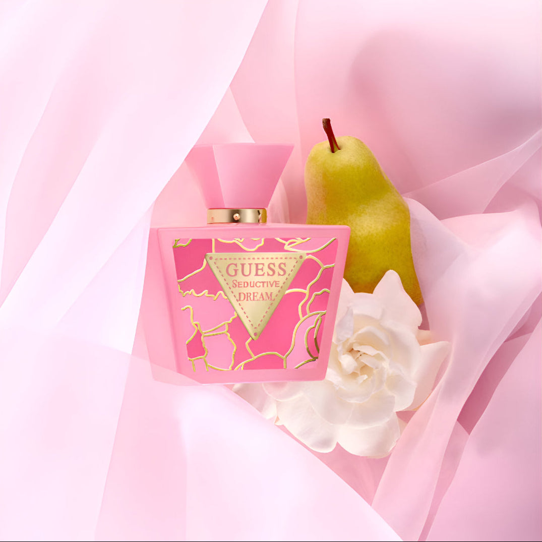 Guess Seductive Dream EDT smells like a delightful mix of sweet fruits like pear and apple, combined with floral notes of gardenia and a warm finish of vanilla and amber, creating a charming and elegant fragrance.