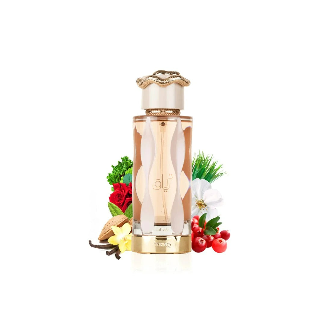 Lattafa Teriaq EDP smells sweet and spicy with notes of pink pepper, caramel, and almond, evolving into a warm blend of honey, rhubarb, and flowers, and finishing with vanilla, leather, and musk for a captivating and long-lasting scent.