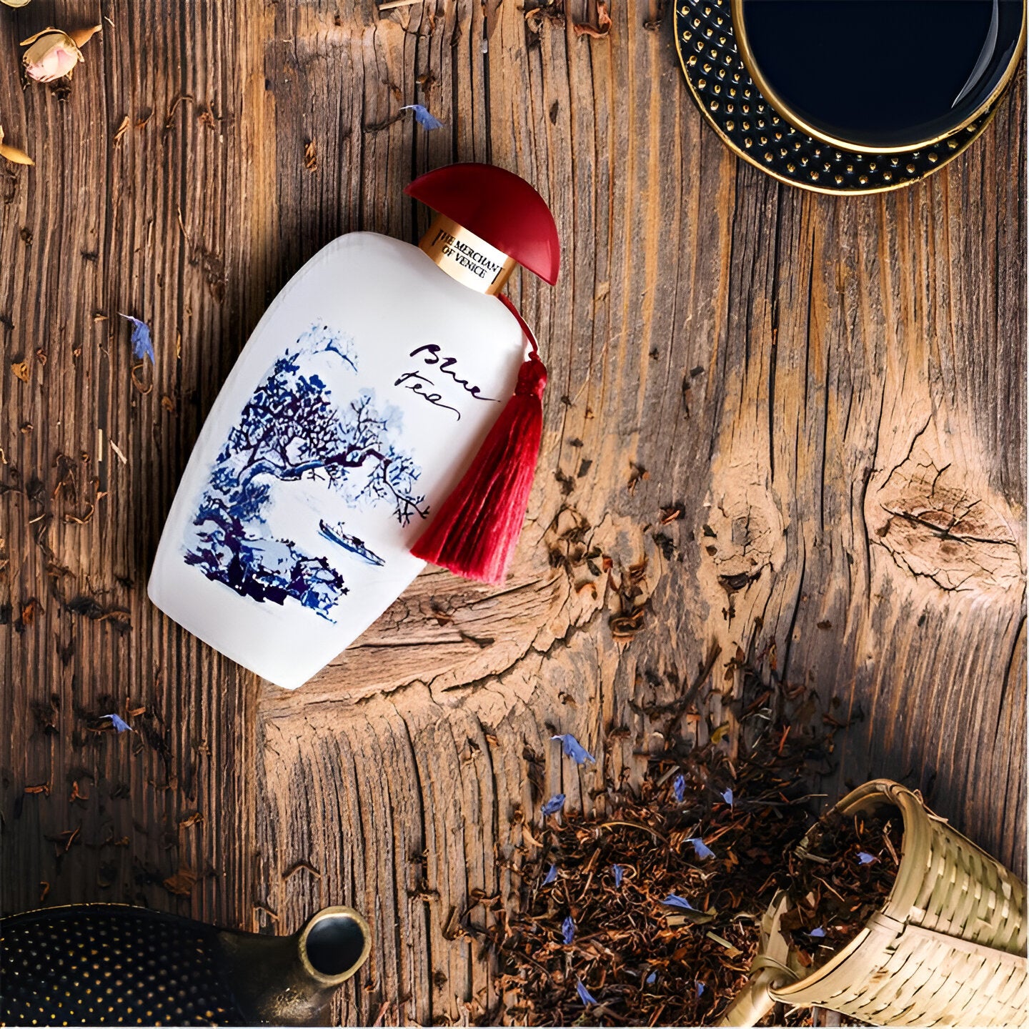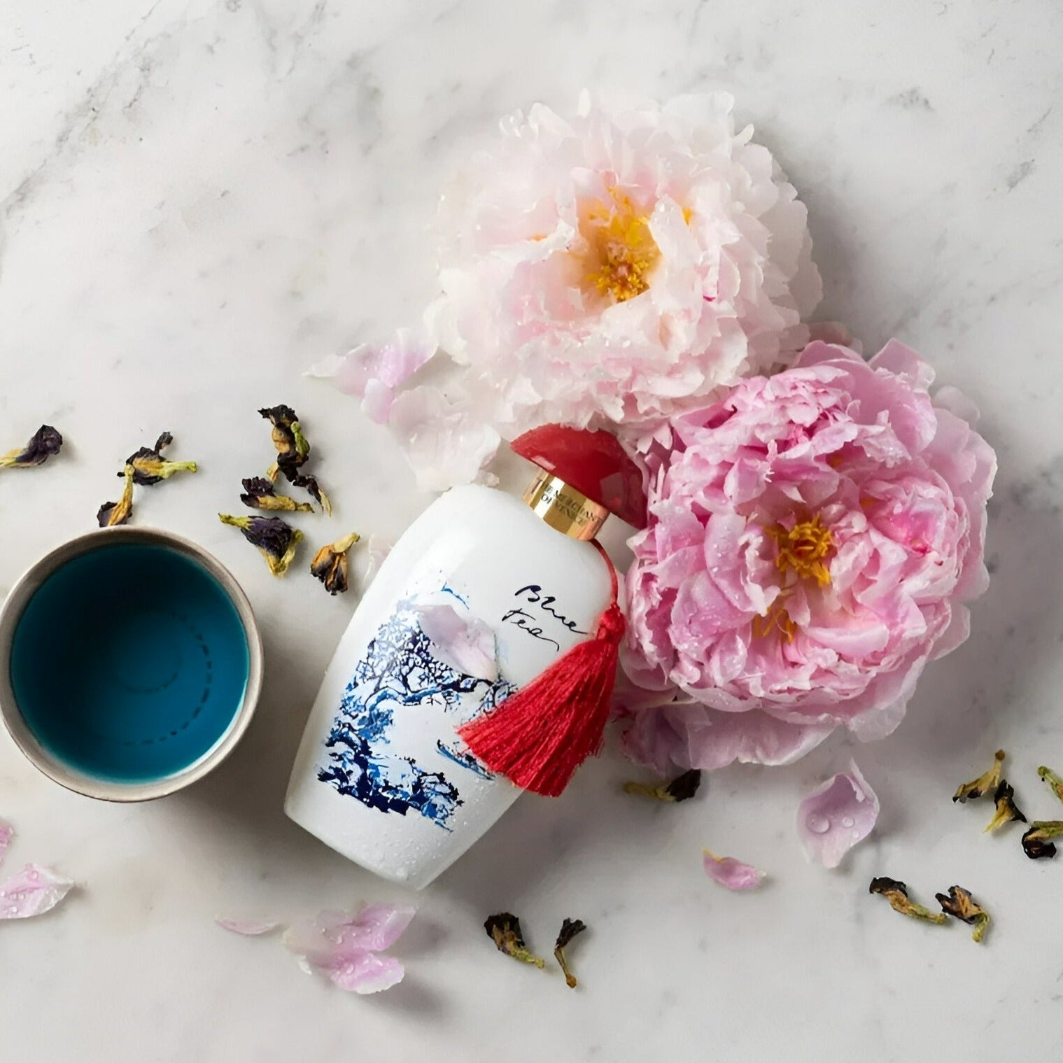 - قلب التكوين: الشاي الأزرق الصيني المكرر.