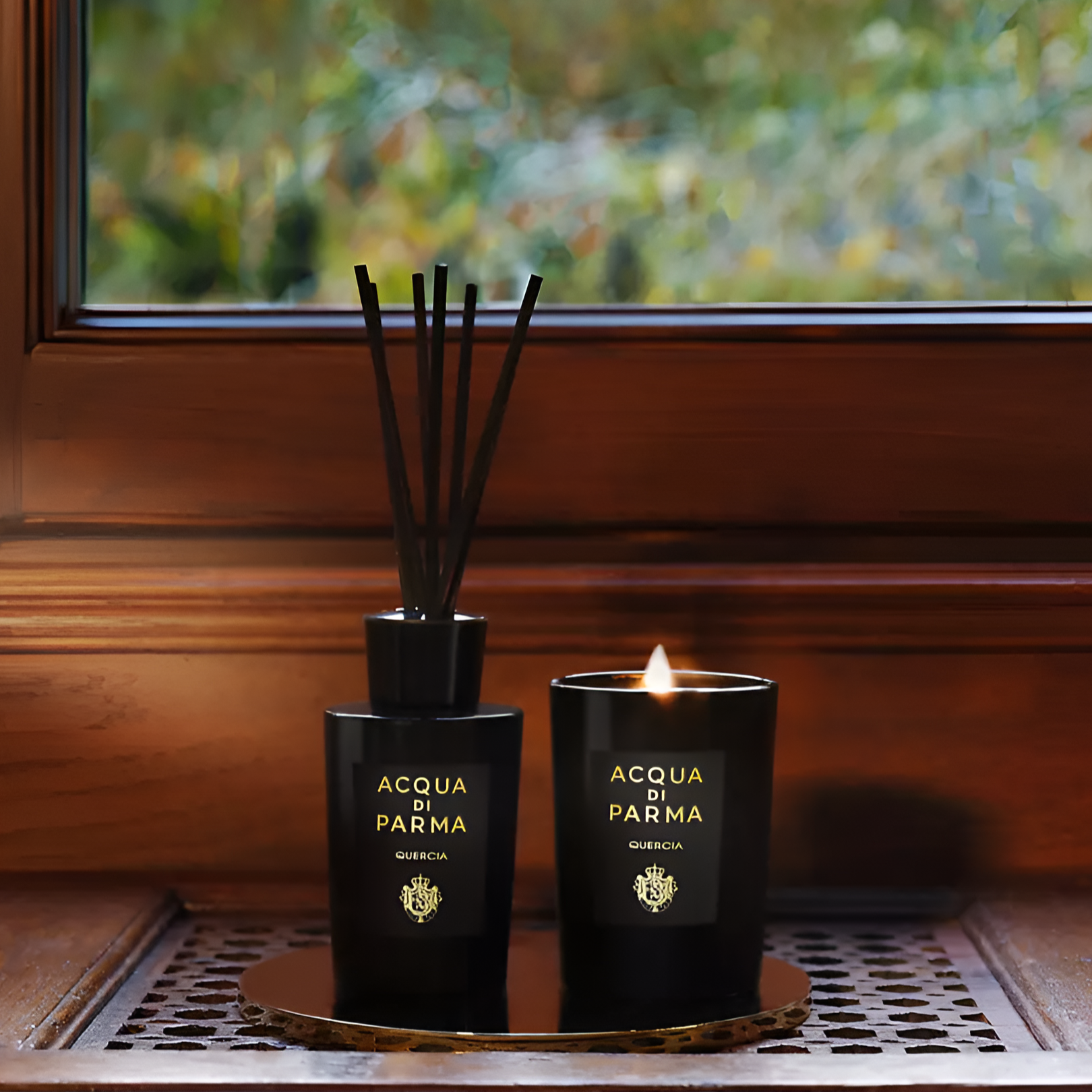 The Acqua Di Parma Quercia Candle smells like a fresh forest walk, with rich oakmoss and bright citrus notes, wrapped in crisp mountain air.