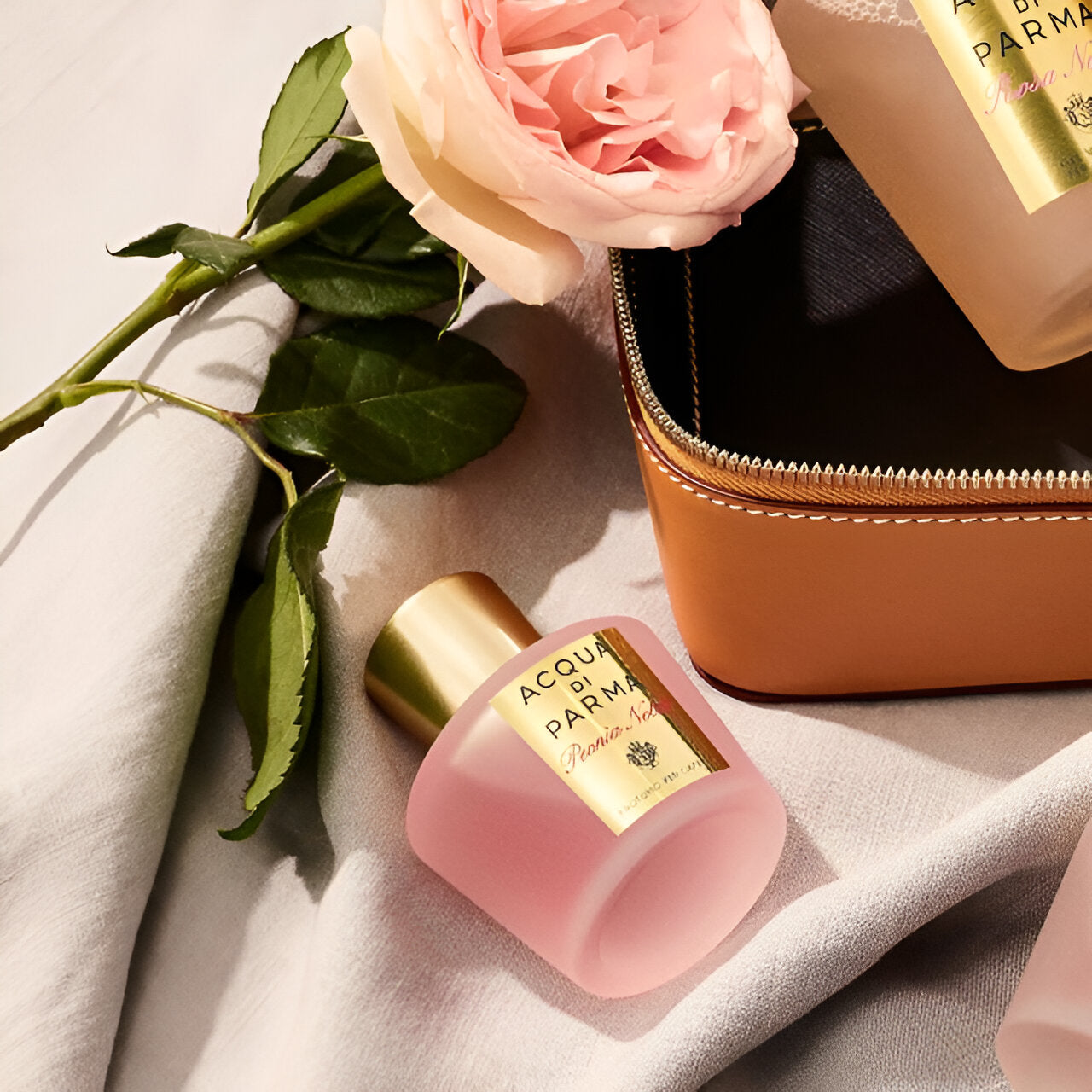 Acqua Di Parma Rosa Nobile Hair Mist smells like a fresh, romantic blend of delicate roses and velvety magnolia petals, capturing the essence of a fragrant Italian garden.