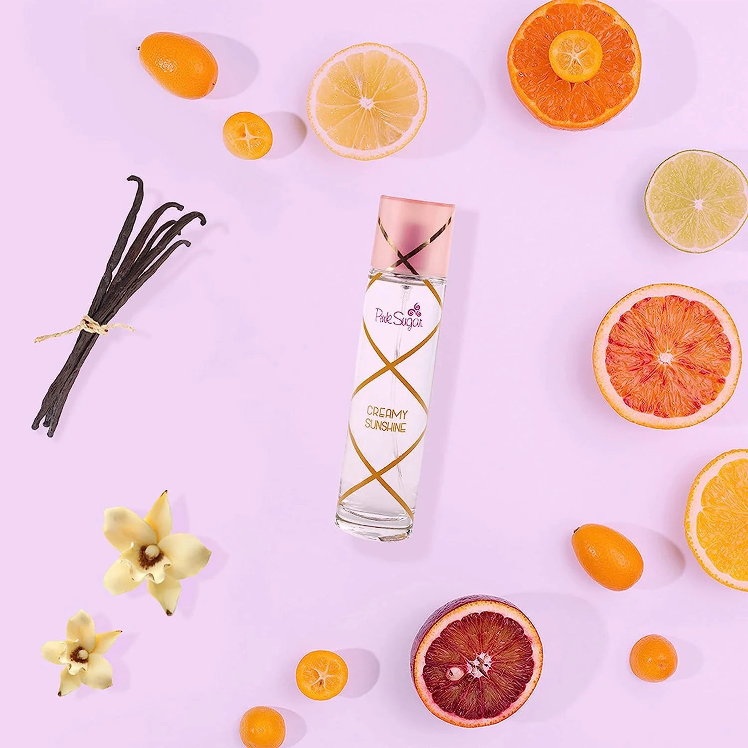 Aquolina Pink Sugar Creamy Sunshine EDT smells sweet and fruity, with notes of delicious vanilla, creamy coconut, and a hint of soft florals, evoking a warm and cheerful vibe perfect for sunny days.