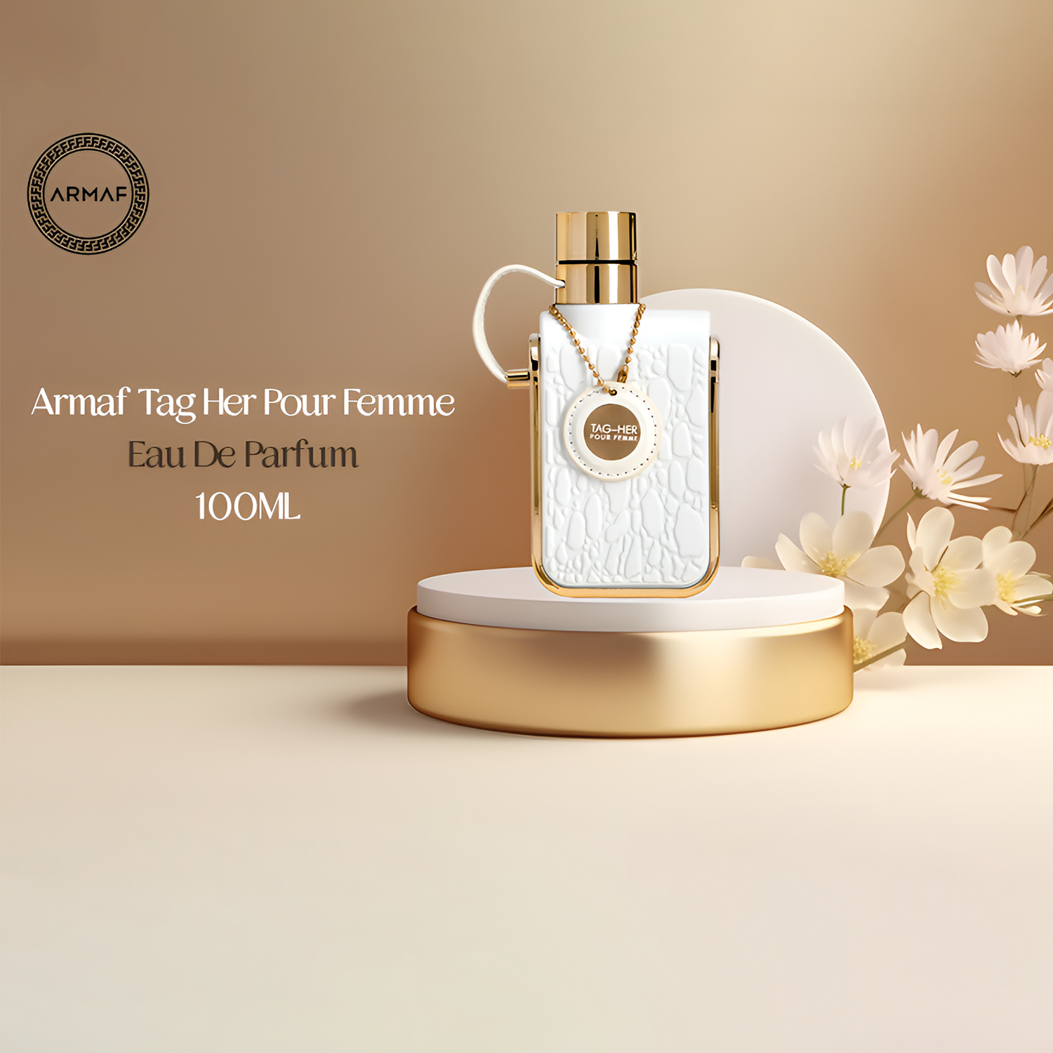 Armaf Tag-Her EDP unfolds as a bold amber floral perfume, blending zesty bergamot, delicate neroli, and a spicy pink pepper top with a heart of fragrant orange blossom, jasmine, and sweet honeysuckle, creating a lasting aura of feminine strength and elegance.