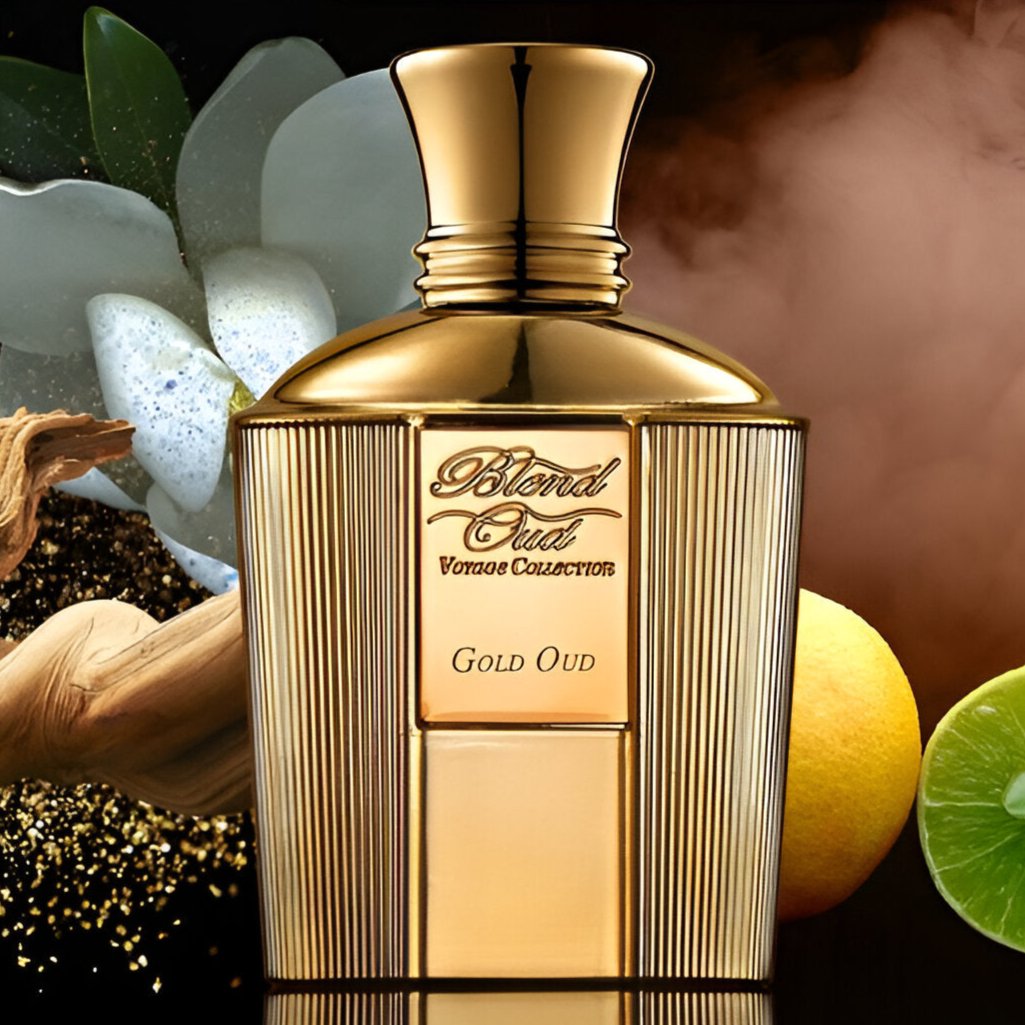 Blend Oud Voyage Collection Gold Oud EDP smells like a rich and alluring blend of oriental spices, fresh citrus, and elegant floral notes, capturing the timeless elegance of Oud.