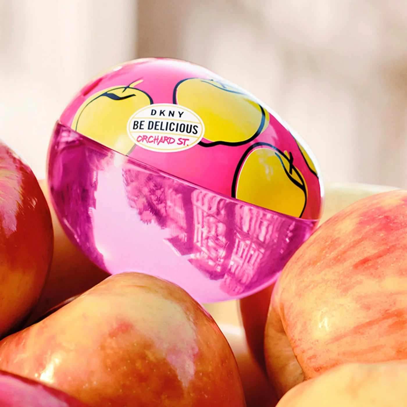 Donna Karan Be Delicious Orchard St. EDP smells fruity and floral, featuring sweet notes of apple, pink grapefruit, and raspberry, capturing a fun and lively essence.