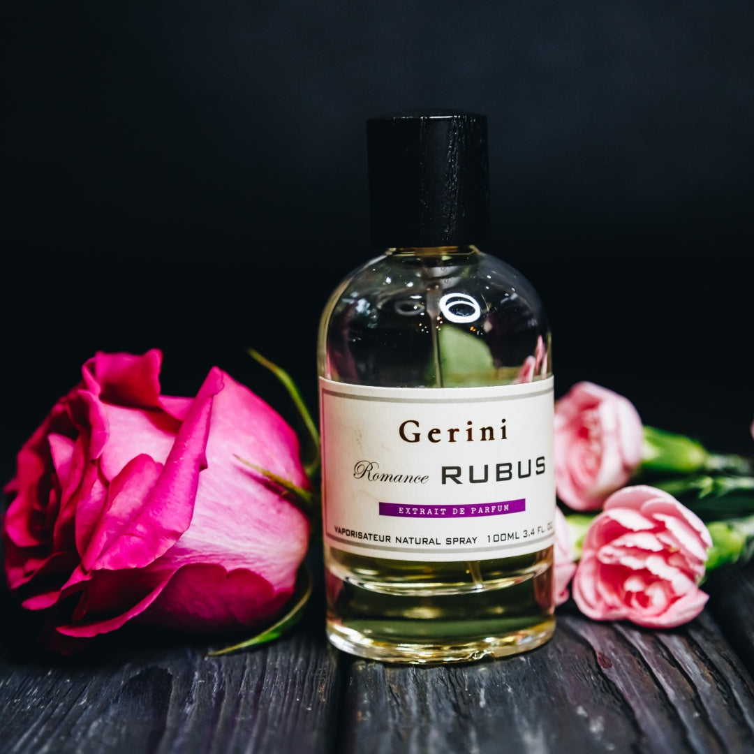 Gerini Romance Rubus Extrait De Parfum smells like a luxurious blend of fresh raspberries and delicate roses, enhanced by warm notes of jasmine, fruity accords, and sweet vanilla, creating a captivating floral-fruity fragrance perfect for any occasion.