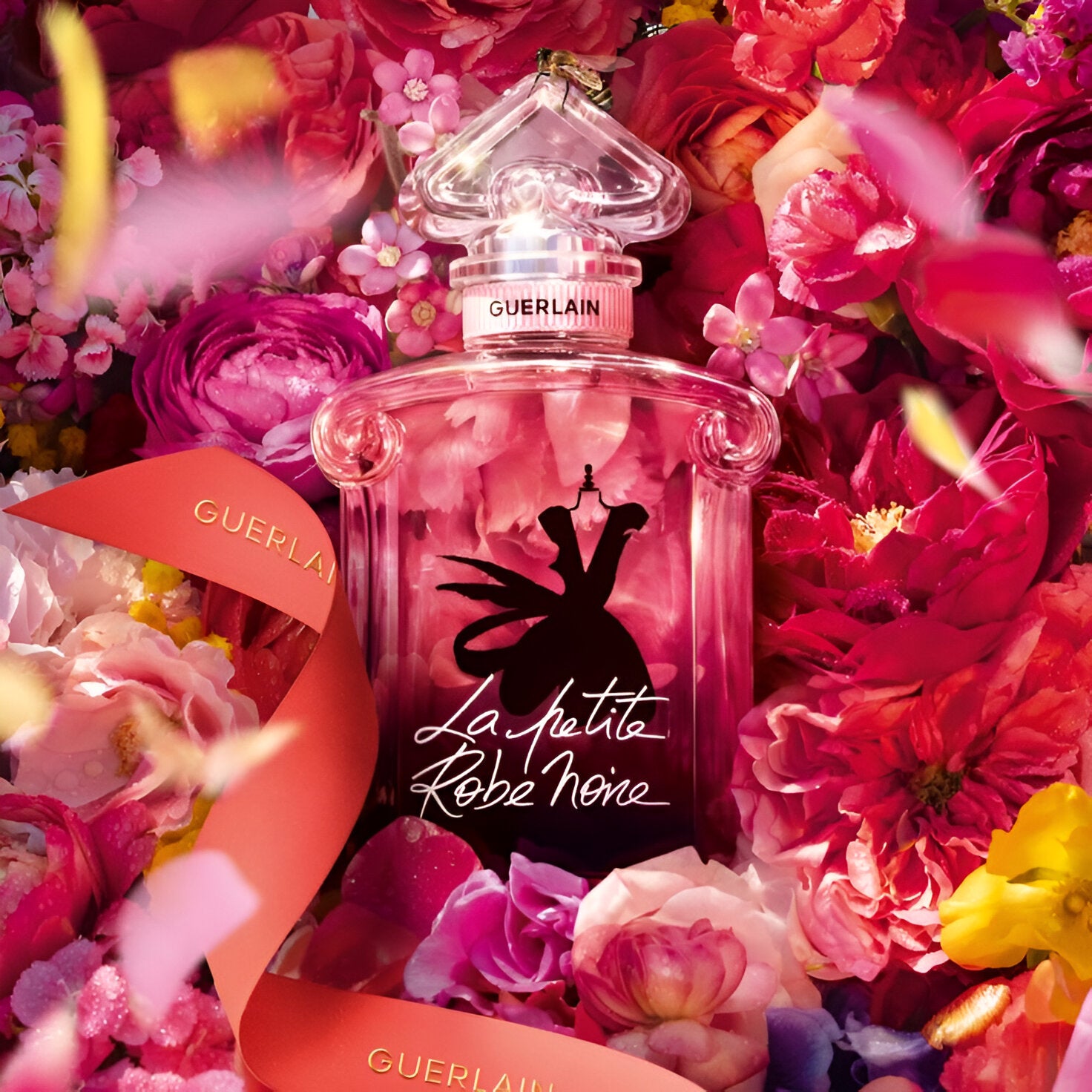 Guerlain La Petite Robe Noire EDP Intense smells like a delicious blend of sweet black cherries, soft roses, and warm vanilla, creating a luxurious and playful fragrance that feels both elegant and fun.