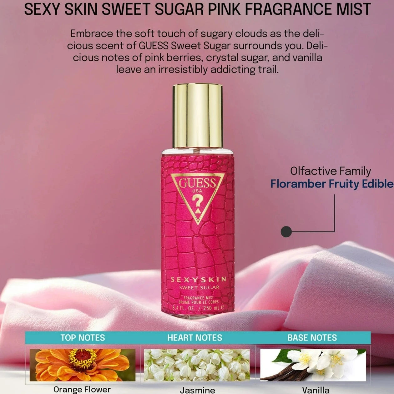 GUESS Sexy Skin Sweet Sugar Body Mist smells like a sweet blend of pink berries, orange flower, and jasmine, with warm vanilla, sandalwood, and almond. It's a flirty, sugary scent for the GUESS Girl.