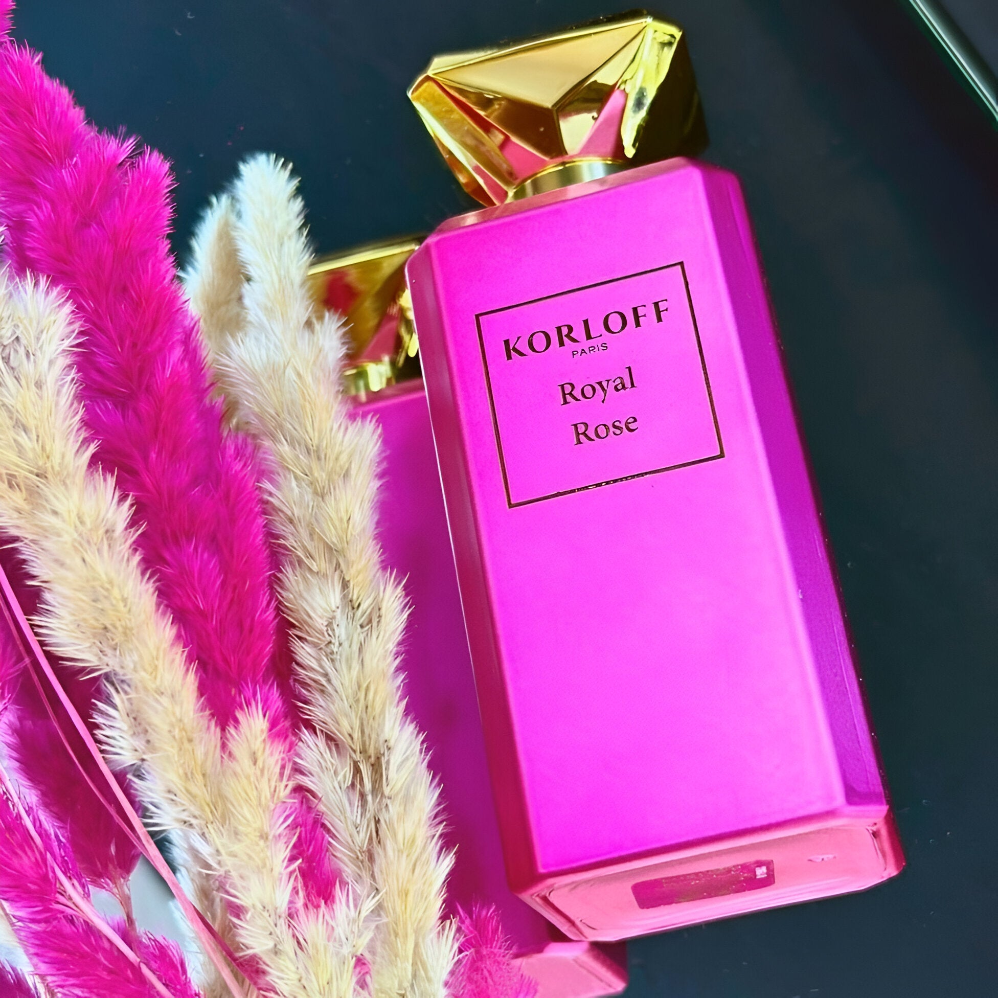 Korloff Paris Royal Rose EDP smells like a luxurious bouquet of roses with a hint of spice, capturing the essence of Parisian romance and timeless elegance.
