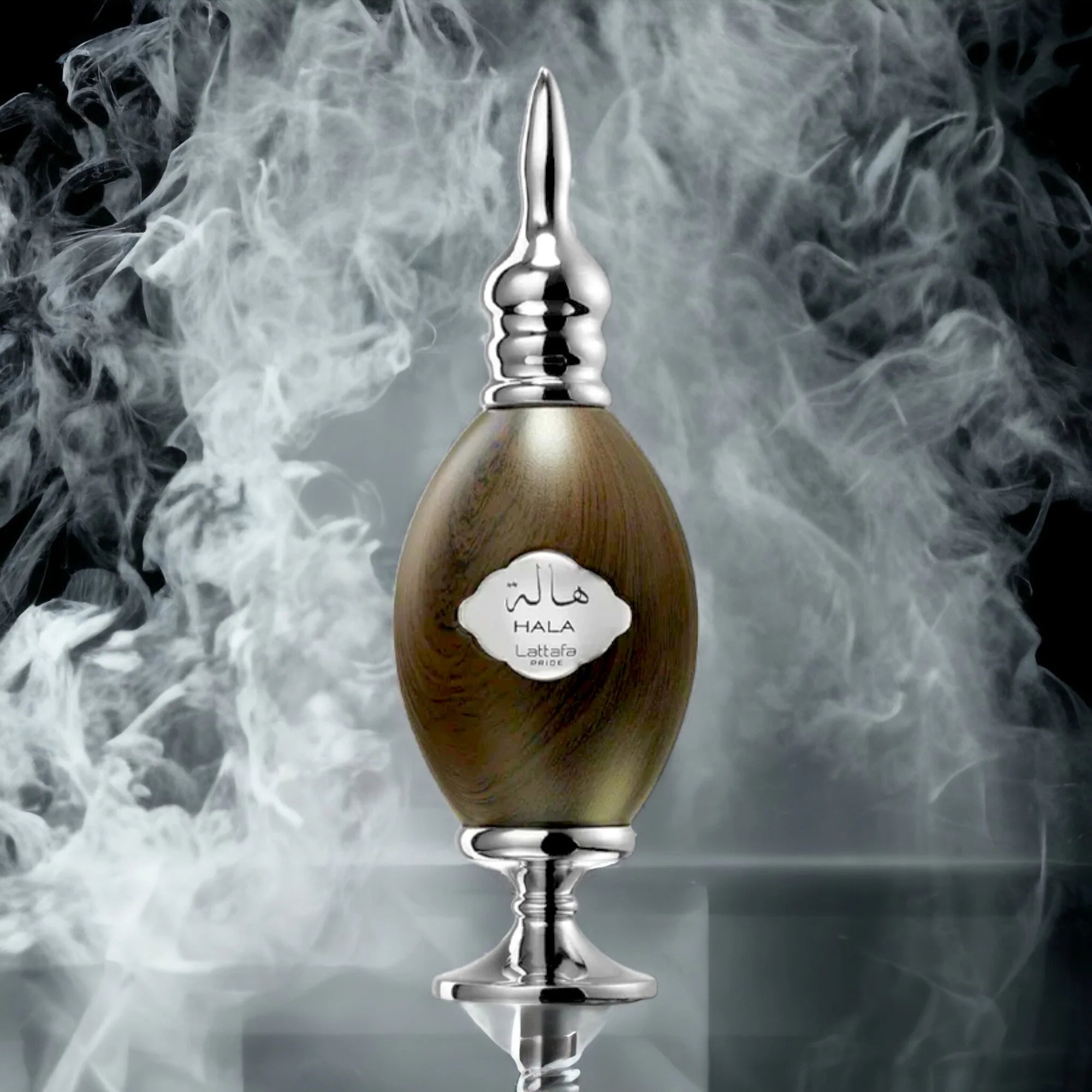 Discover Lattafa Pride Hala EDP: a blend of pepper, nutmeg, cedarwood, and incense for luxury and sophistication.
