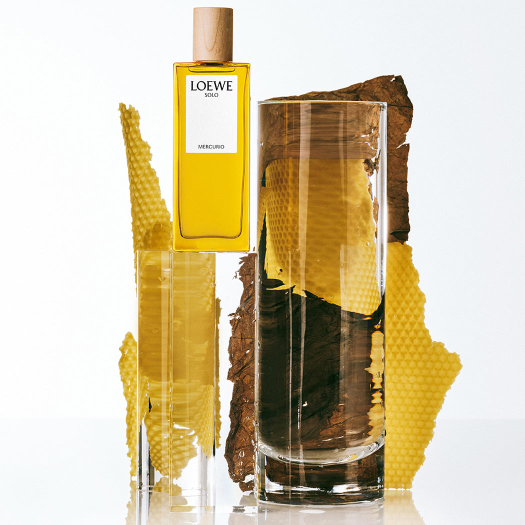Loewe Solo Loewe Mercurio EDP smells like a sophisticated blend of fresh fig leaf, floral lavender, warm honey tobacco, and rich amber, creating a deep and intriguing scent for confident men.