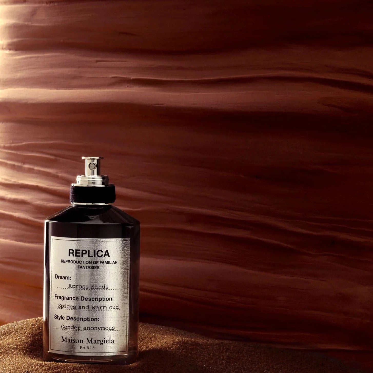 Maison Margiela Replica Across Sands EDP smells of warm spices, rich oud, sweet dates, and soft floral notes, evoking a sun-drenched desert ambiance.