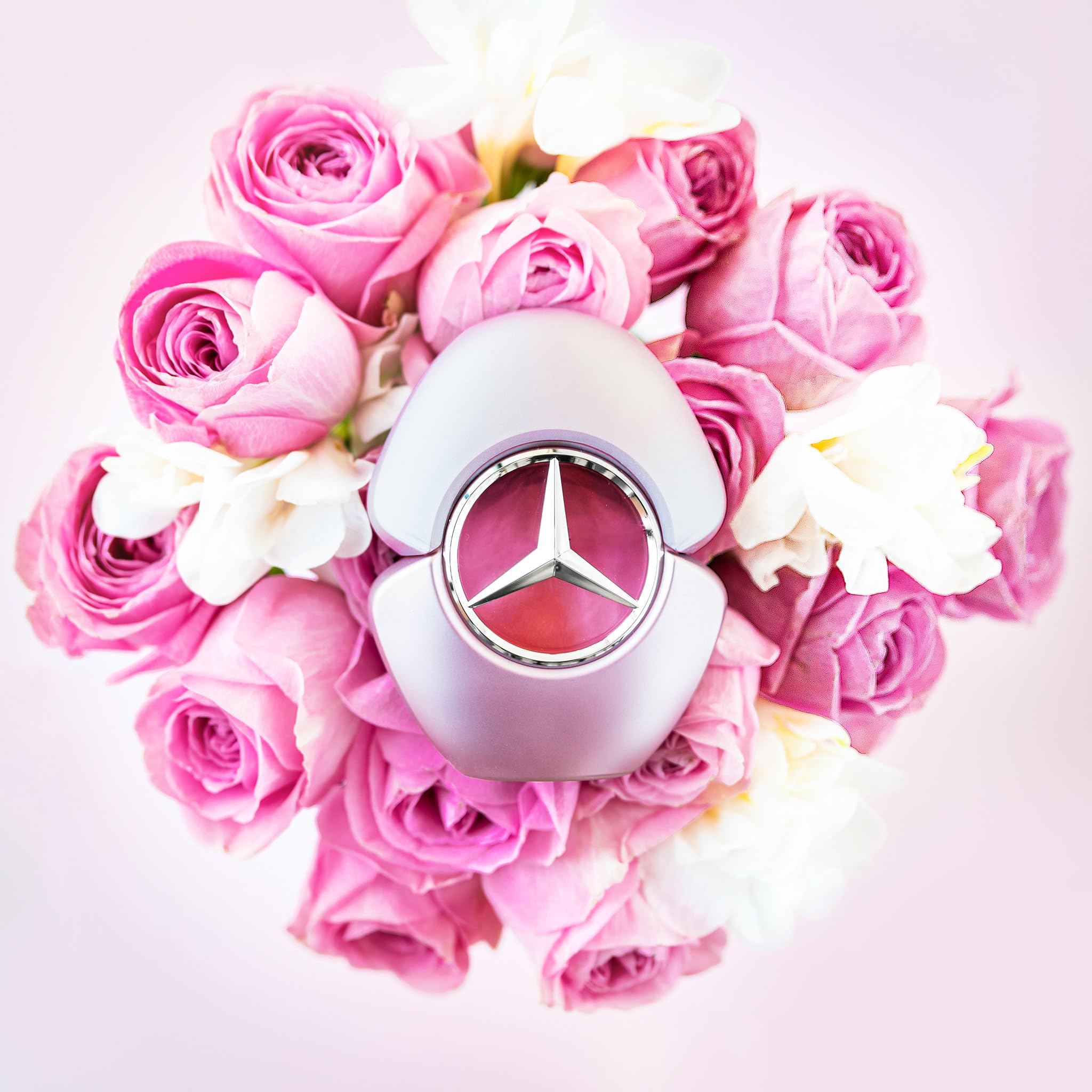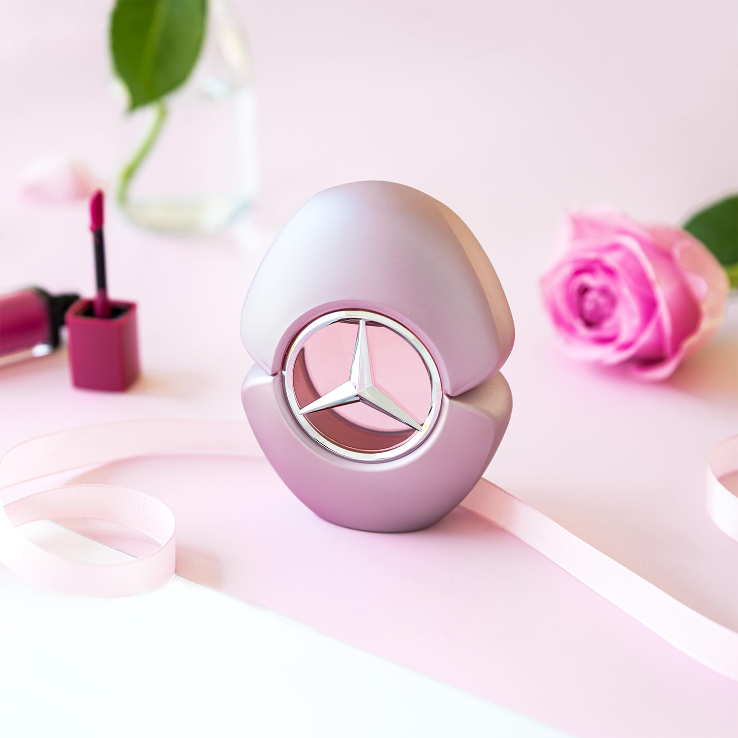 Mercedes Benz Woman Rollerball EDP smells like a luxurious blend of sweet vanilla, romantic rose, soft white musk, and earthy patchouli, creating an elegant and empowering fragrance that embodies femininity.