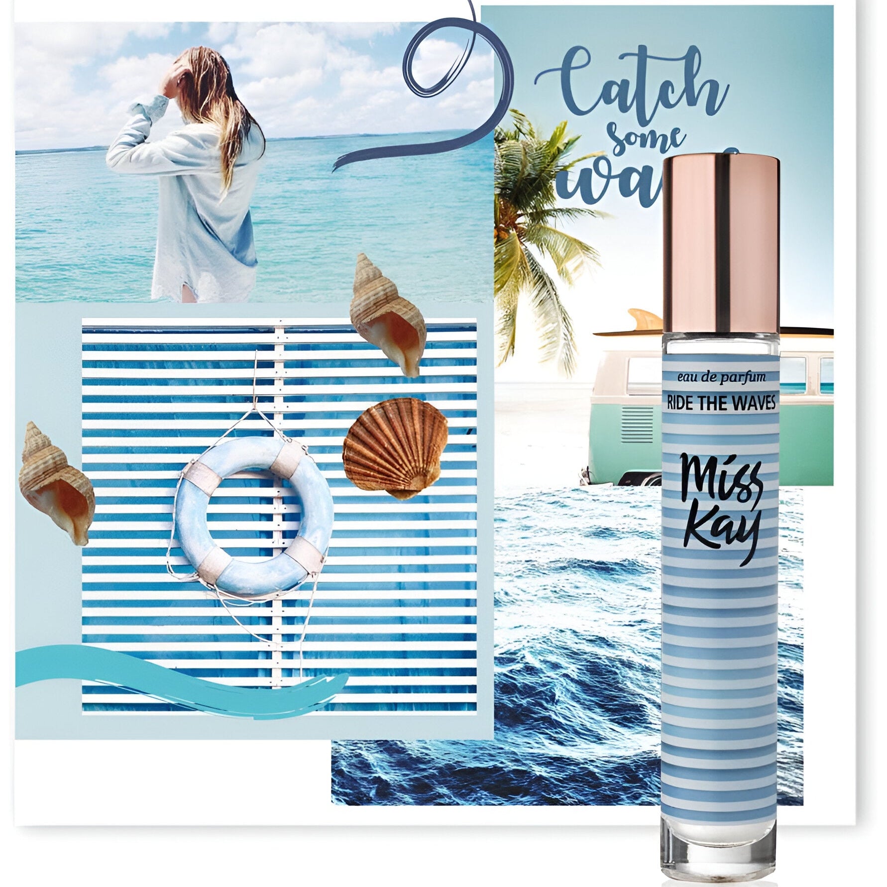 Miss Kay Ride The Waves EDP smells like a refreshing ocean breeze mixed with sweet and woody notes, evoking a sense of adventure and inspiration that makes you feel like you're basking on sunlit shores.