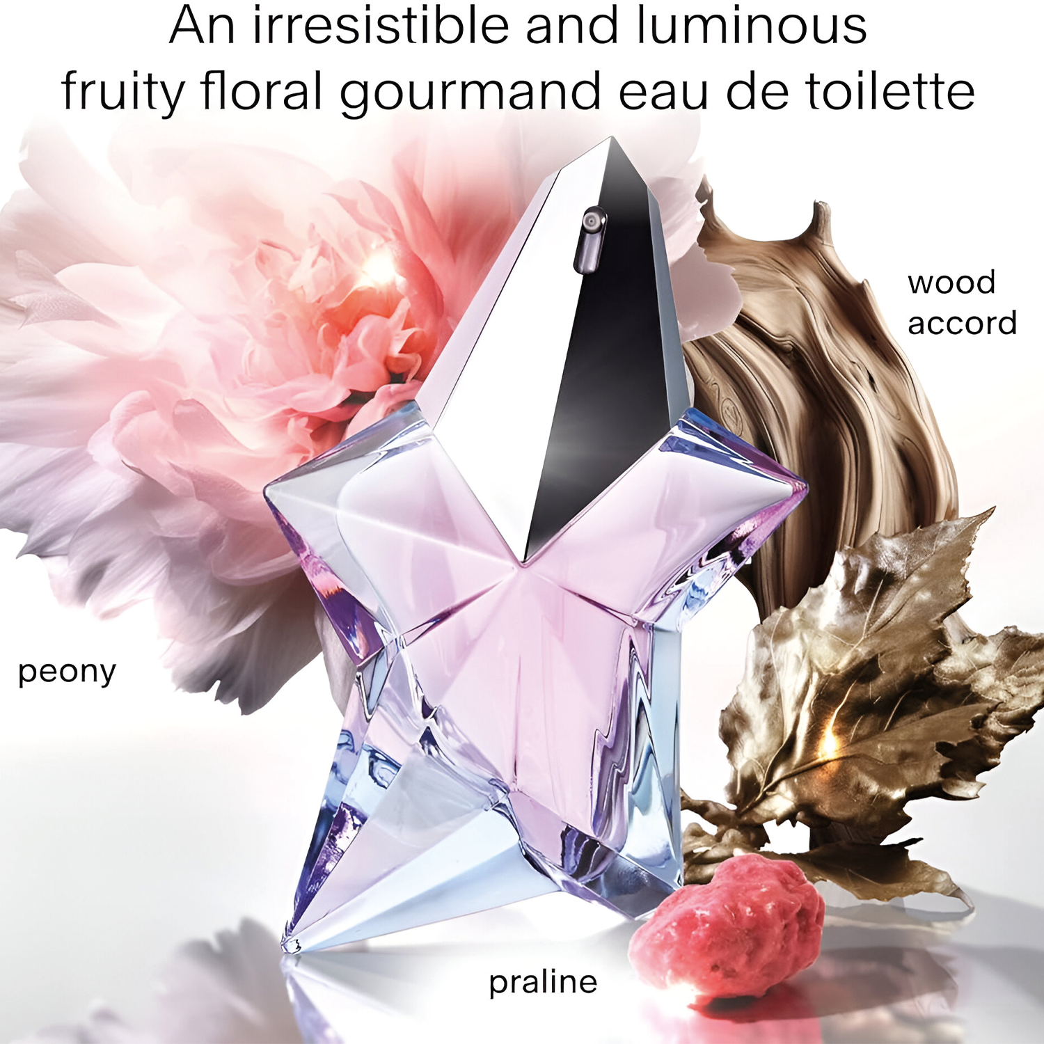 Mugler Angel EDT smells like a dreamy mix of sweet red currant, fresh bergamot, and soft praline. It's a bold, woody floral scent that's vegan and kind to animals.