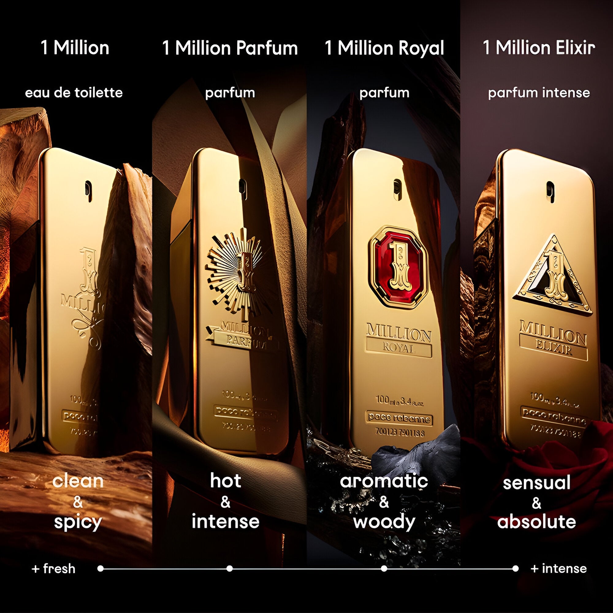 Paco Rabanne 1 Million Elixir smells intensely fresh and woody, with a deep, sensual richness and a mix of earthy notes and sweet warmth.