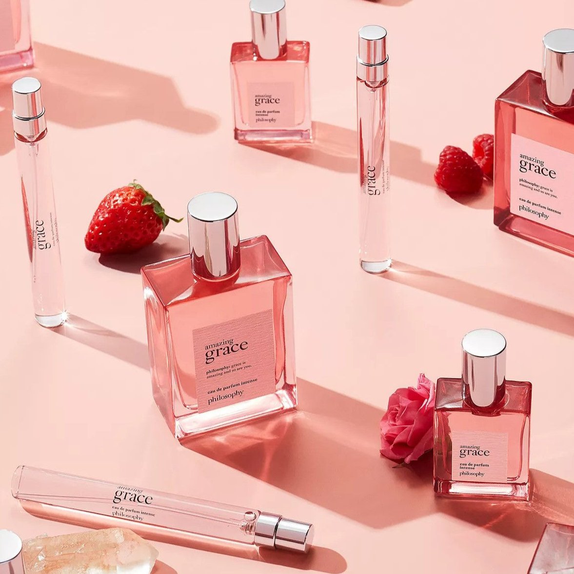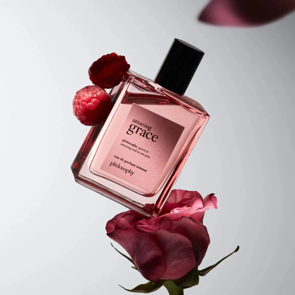 Philosophy Amazing Grace Eau de Parfum Intense smells like a luxurious blend of juicy berries, delicate rose, and warm musk, creating a fruity and floral fragrance that lasts all day.