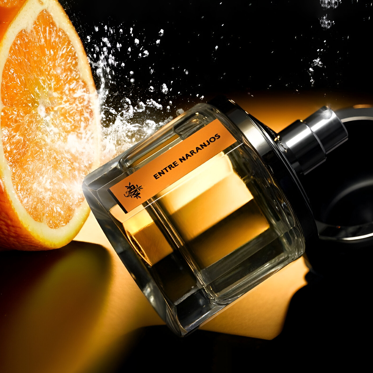 Ramon Monegal Entre Naranjos EDP smells like a vibrant blend of fresh orange blossoms, zesty orange peel, and a harmonious mix of woody, fruity, and spicy notes, evoking the joyful essence of an orange tree courtyard in full bloom.