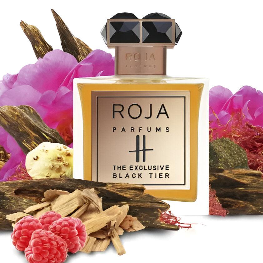 Roja Parfums H The Exclusive Black Tier Candle has a luxurious scent that blends rich notes of dark woods, warm spices, and a hint of sweet florals, creating an inviting and sophisticated aroma.