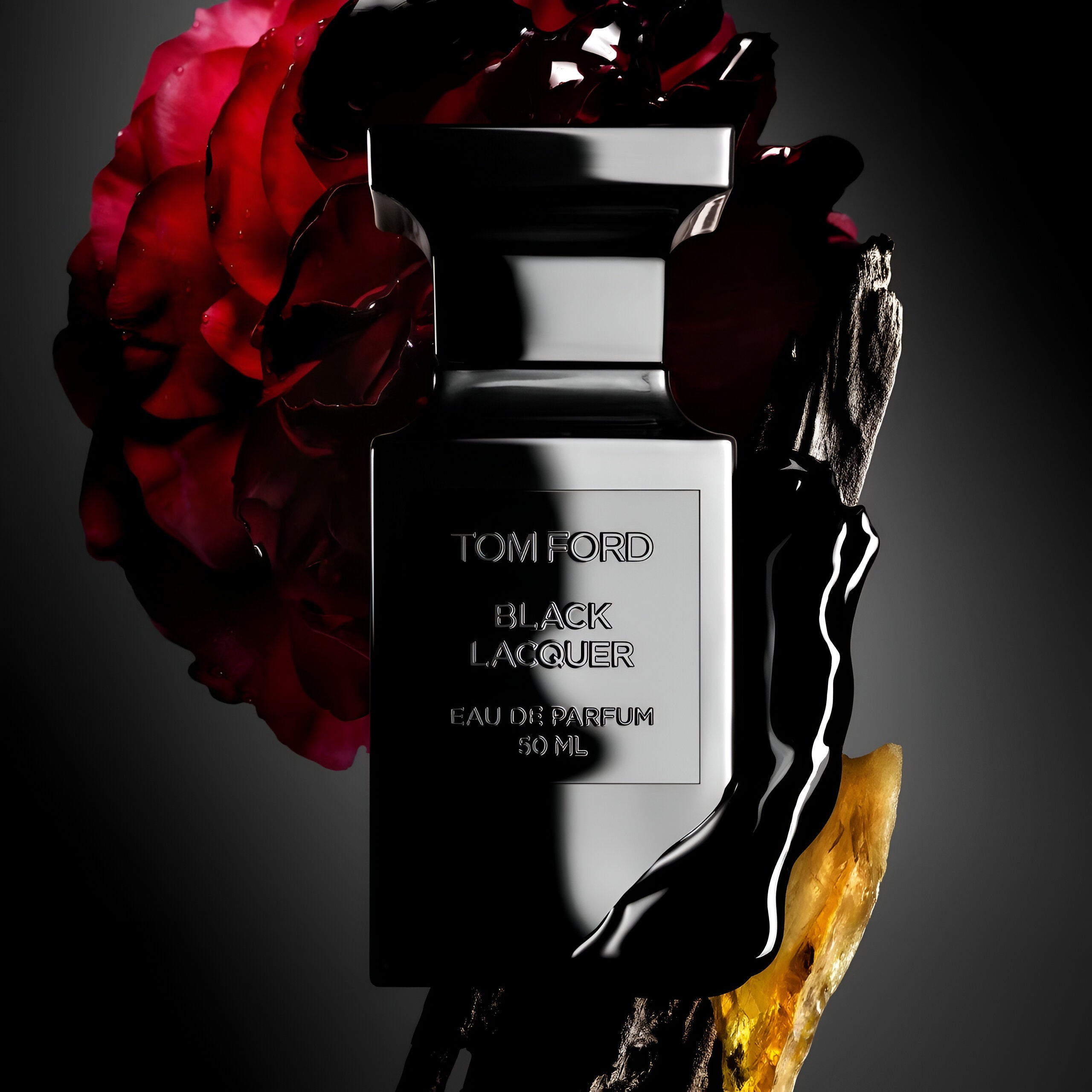 Tom Ford Black Lacquer EDP smells rich and sophisticated, featuring warm amber and woody notes with hints of floral and black truffle, creating a luxurious and mysterious scent.