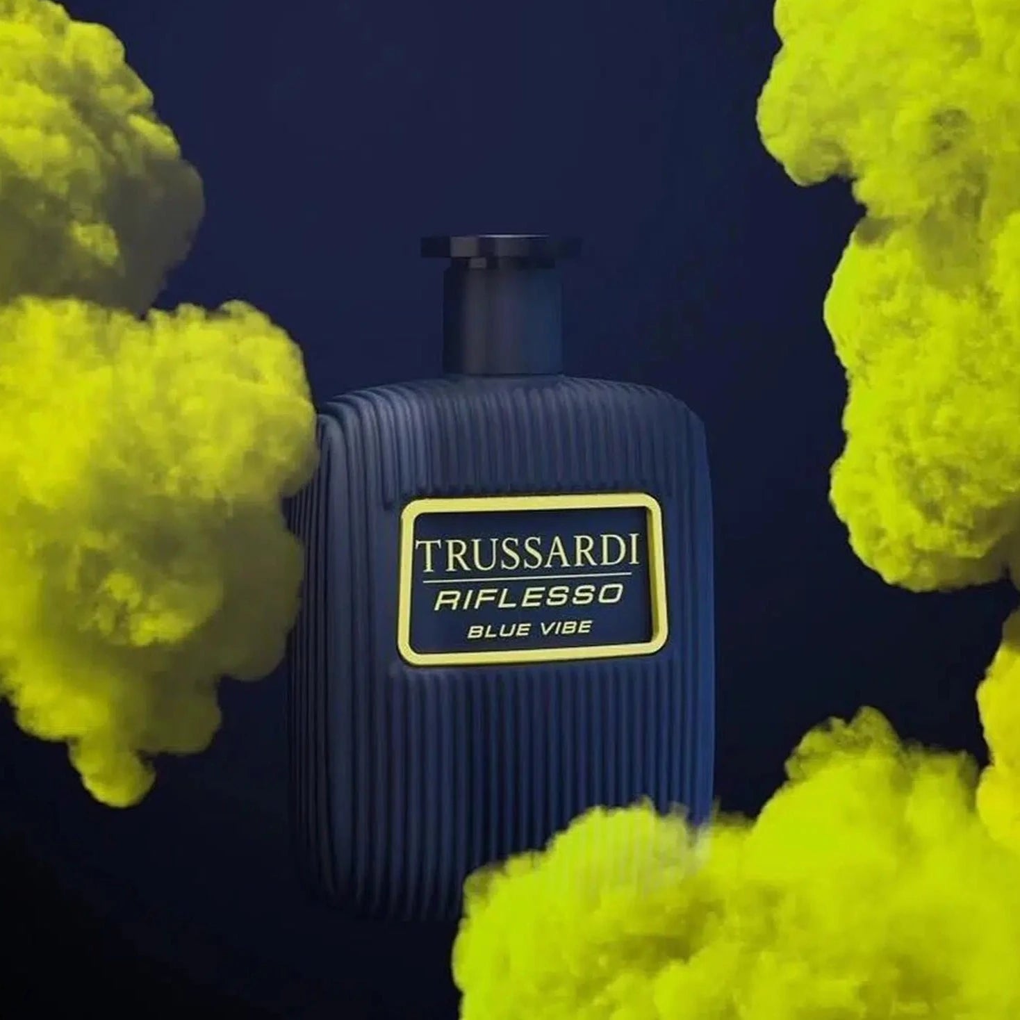 Trussardi Riflesso Blue Vibe EDT smells of geranium, hazelnut, with deep notes of amberwood, tobacco, and Italian leather, capturing a warm, sophisticated Caribbean evening.