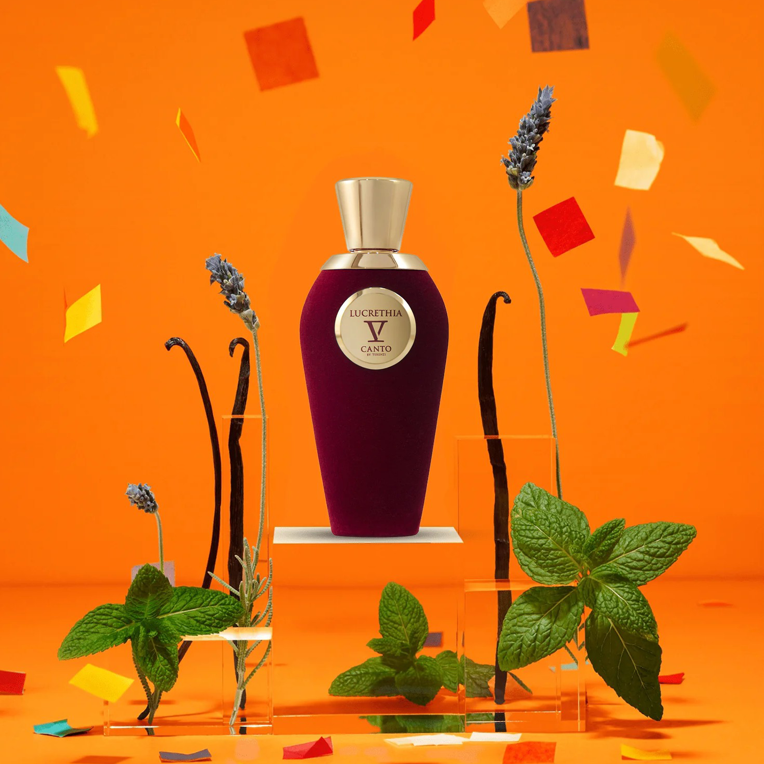 V Canto Lucrethia Extrait de Parfum is an amber-floral extrait that blends bright fruit, warm spices and rich gourmand depth. It balances sparkling pear and pink pepper with a dark coffee-cocoa heart and a creamy vanilla-cedar drydown.