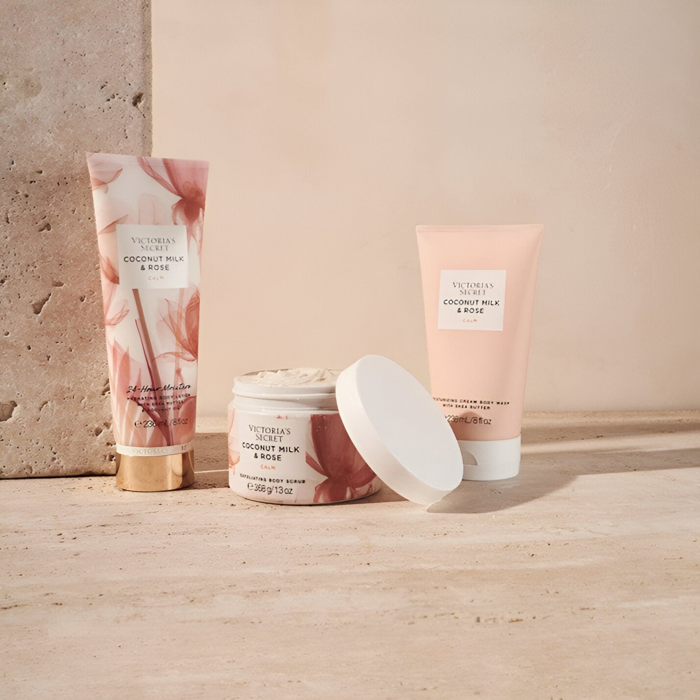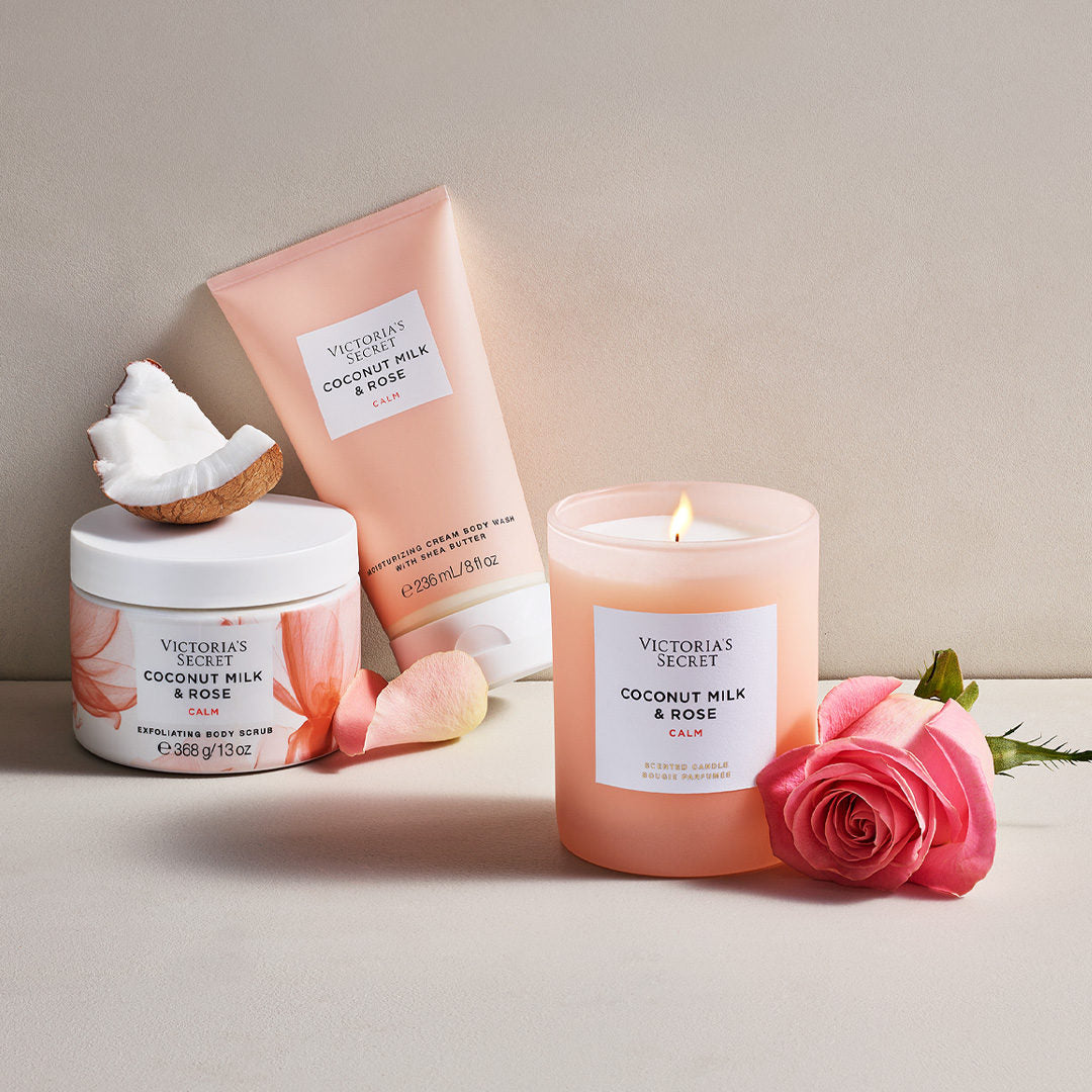 Indulge in the serene embrace of Victoria's Secret Coconut Milk & Rose Calm Body Scrub.