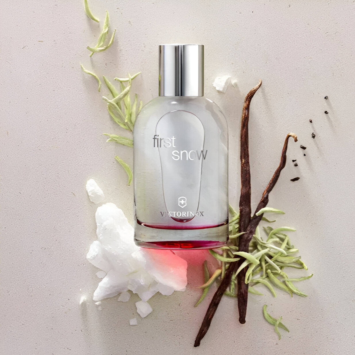 Victorinox Swiss Army First Snow EDT smells like a comforting blend of delicate white florals, soft musk, and warm woody notes, capturing the peaceful essence of a serene winter landscape.